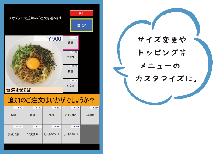 大盛り・小盛りやトッピングなど、メニューにアレンジオプションを付加できます。